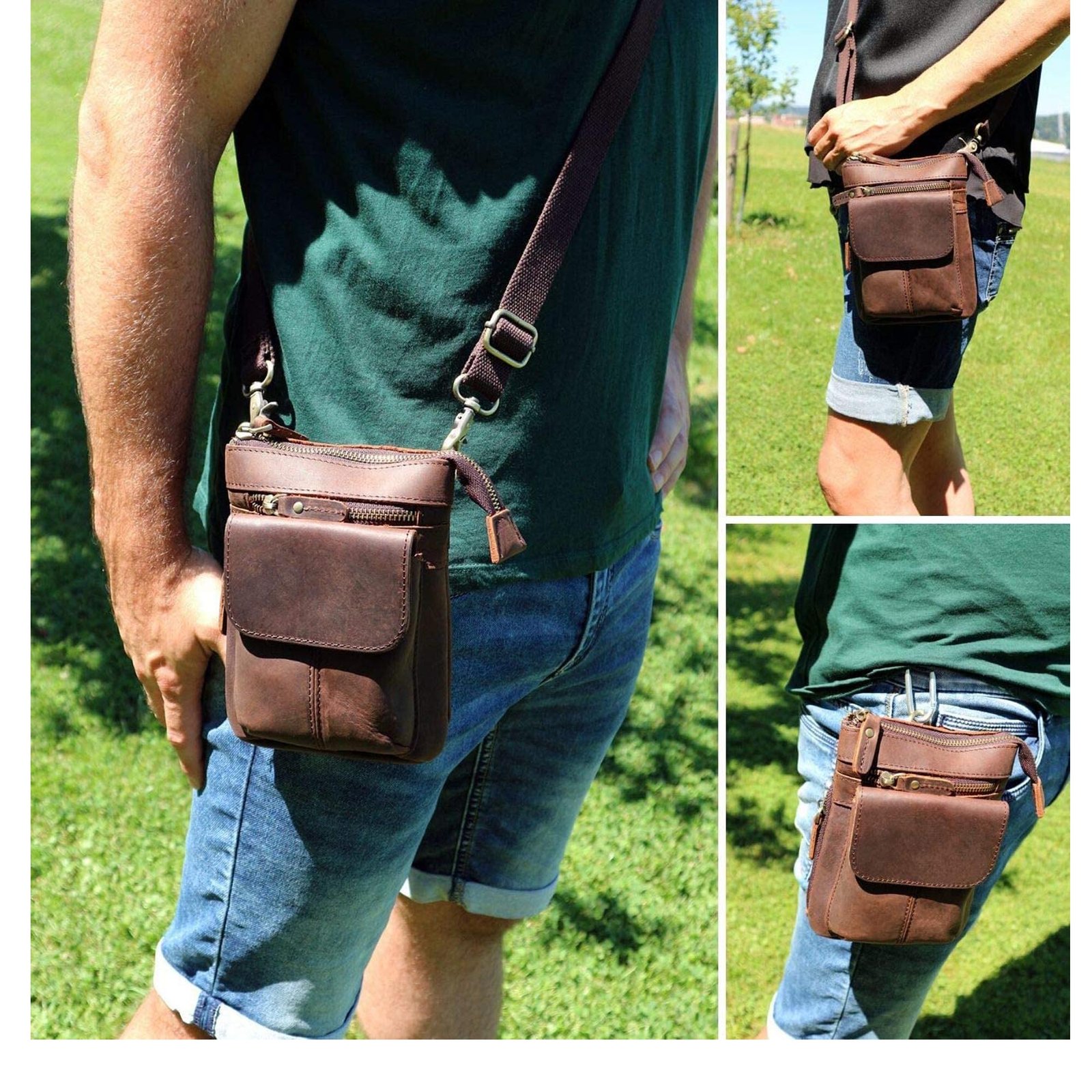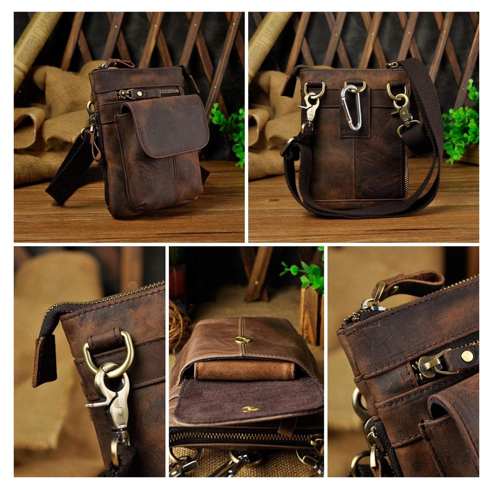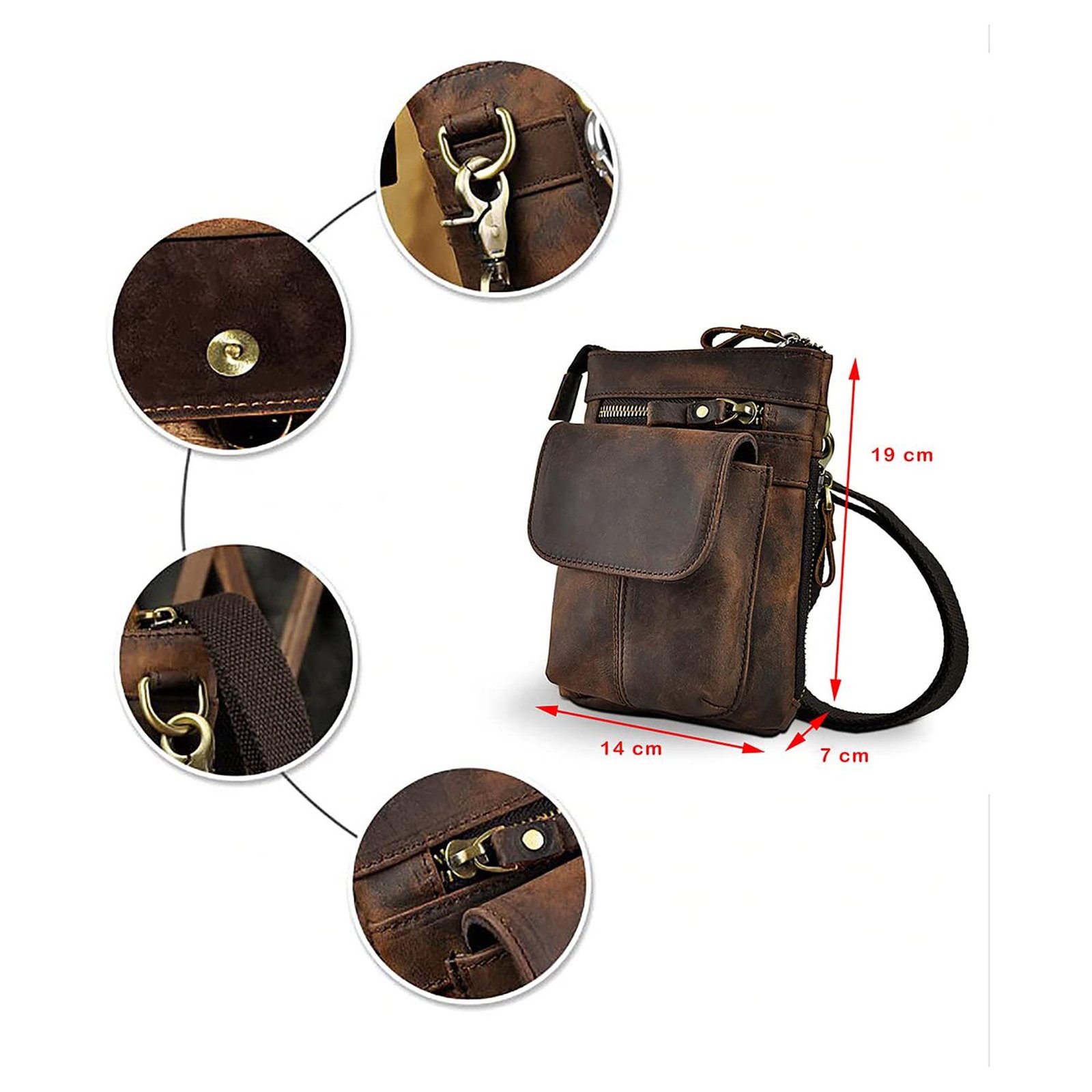 1 Main Large Zip compartment / 1 Front Pocket / 1 Front Zip Pocket / 1 Side Zip Pocket / Inside Zip Pockets / Inside Credit Card Case / Inside Pen Case / Back Side Hook for hanging waist